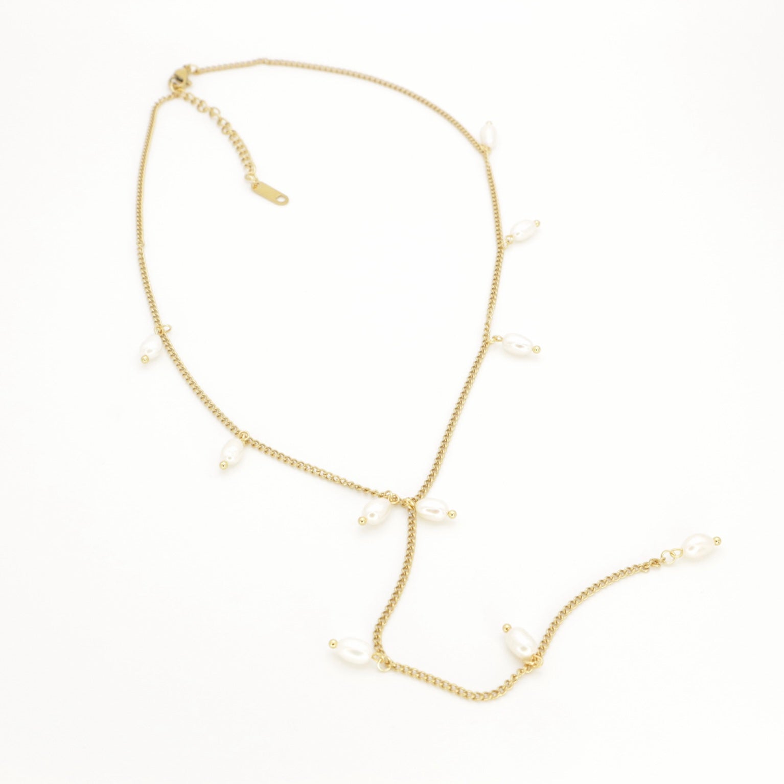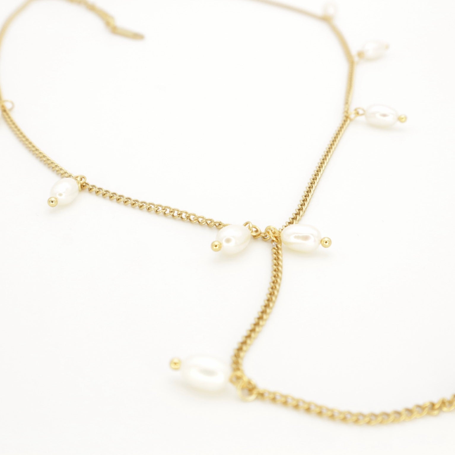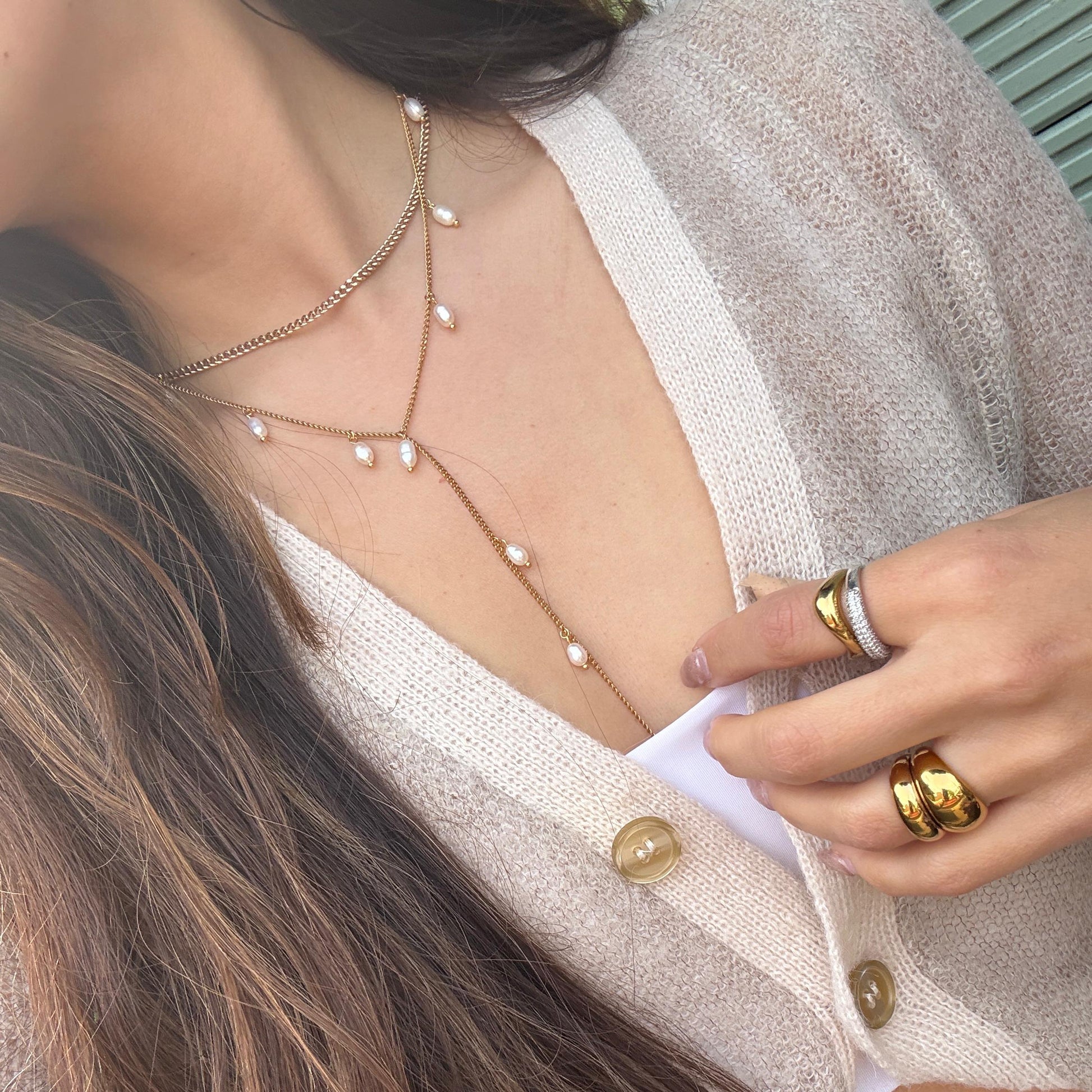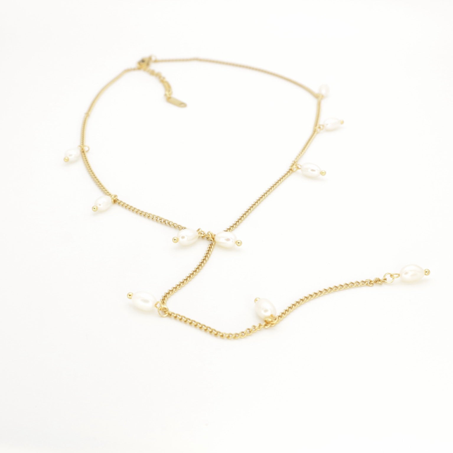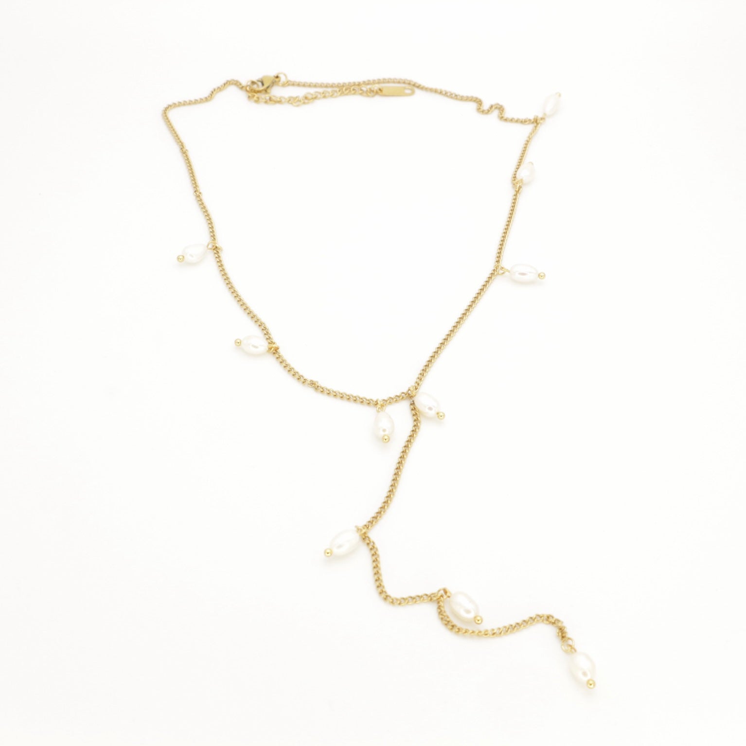 Description: This dainty but bold pearl necklace is the perfect summer statement piece! With a long front chain - perfect for those bikini outfits, or summer tops!