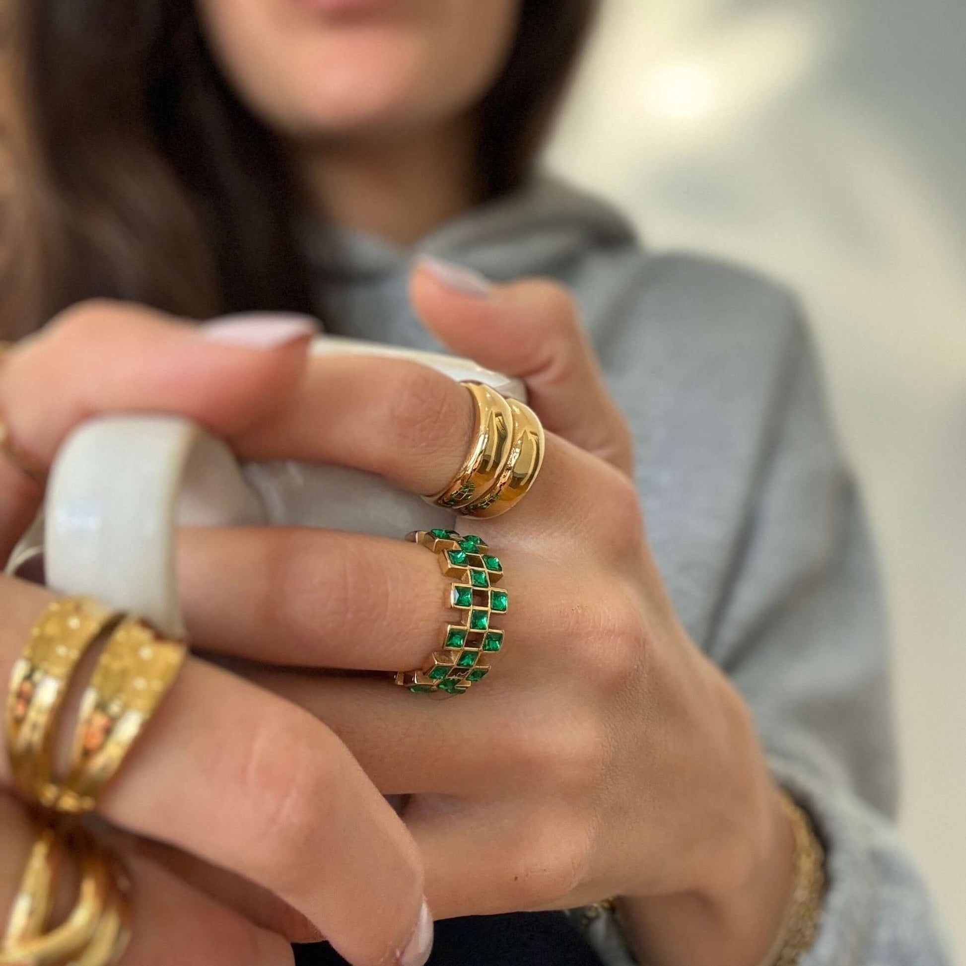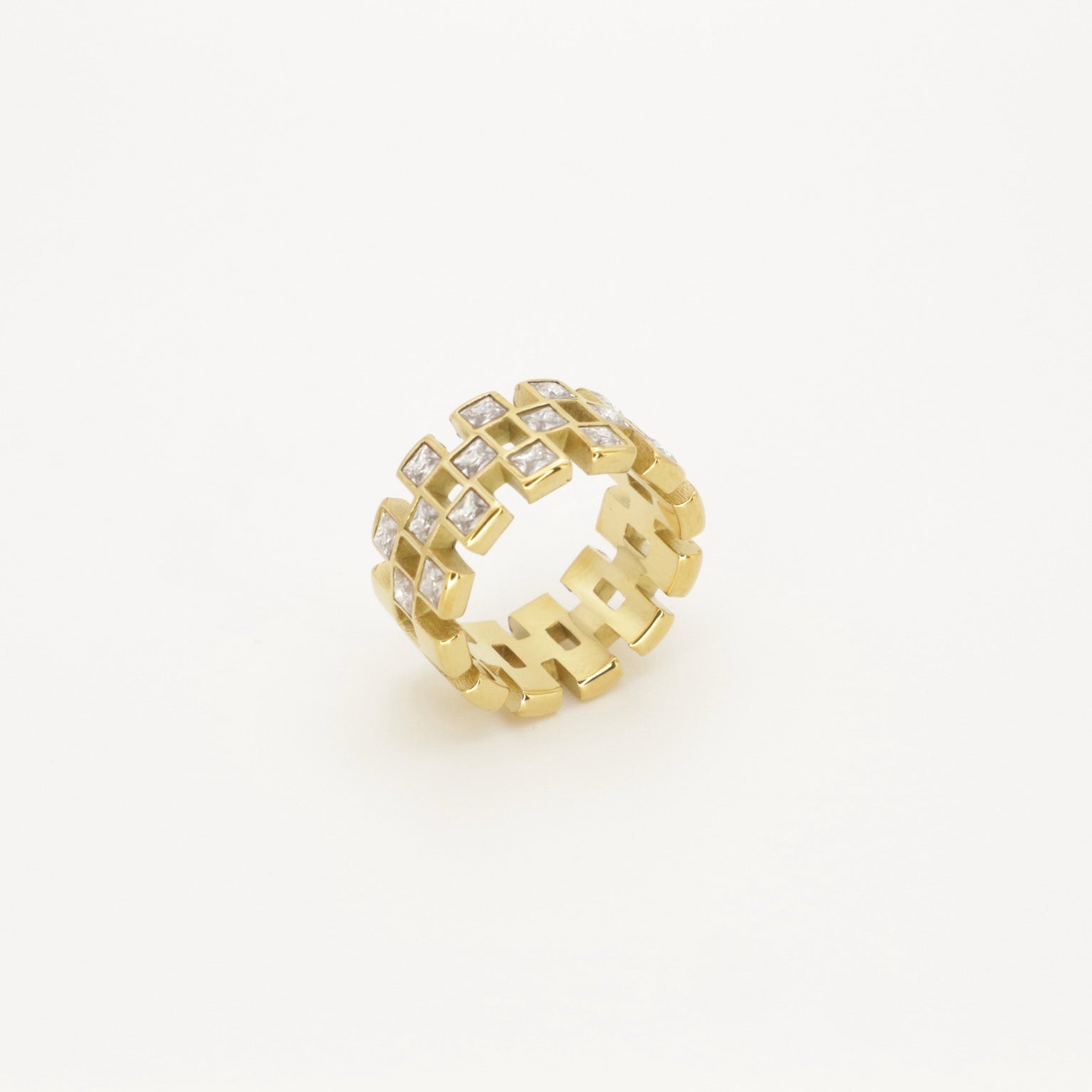 Description: These bold checkered rings are made with 18k gold, Stainless Steel with PVD plating - meaning they are made to be durable. These statement rings will add a touch of colour and sparkle to every occasion and moment.