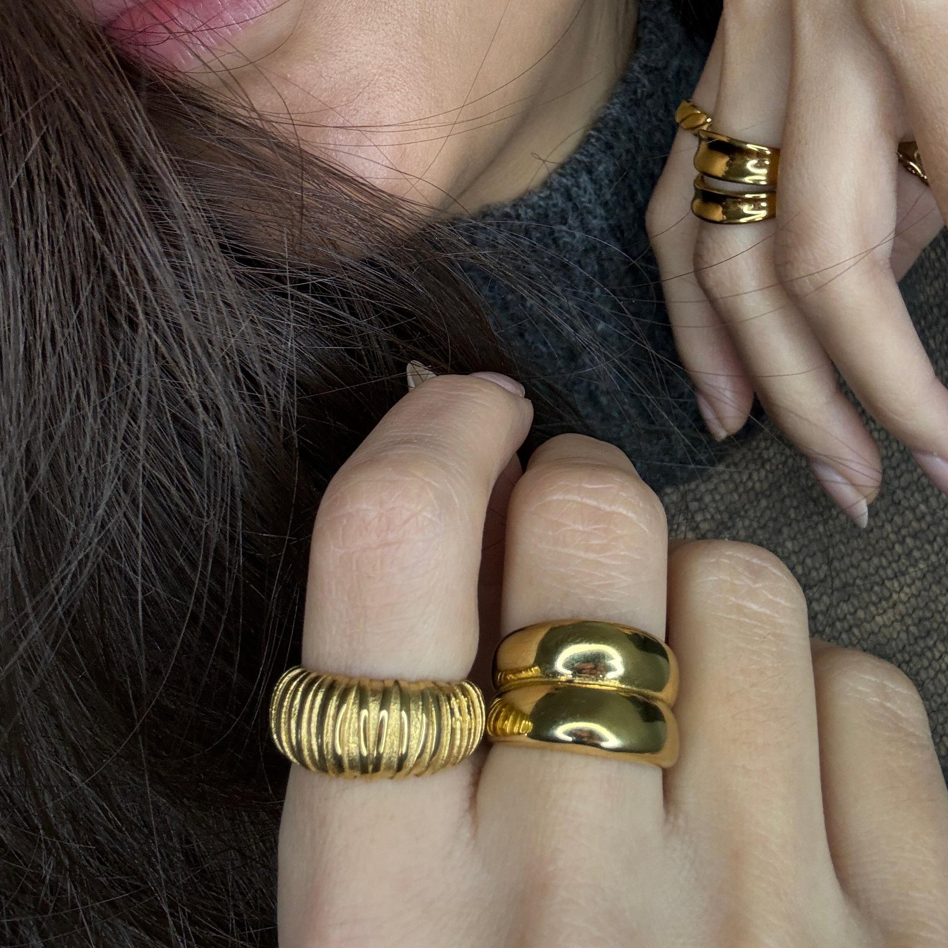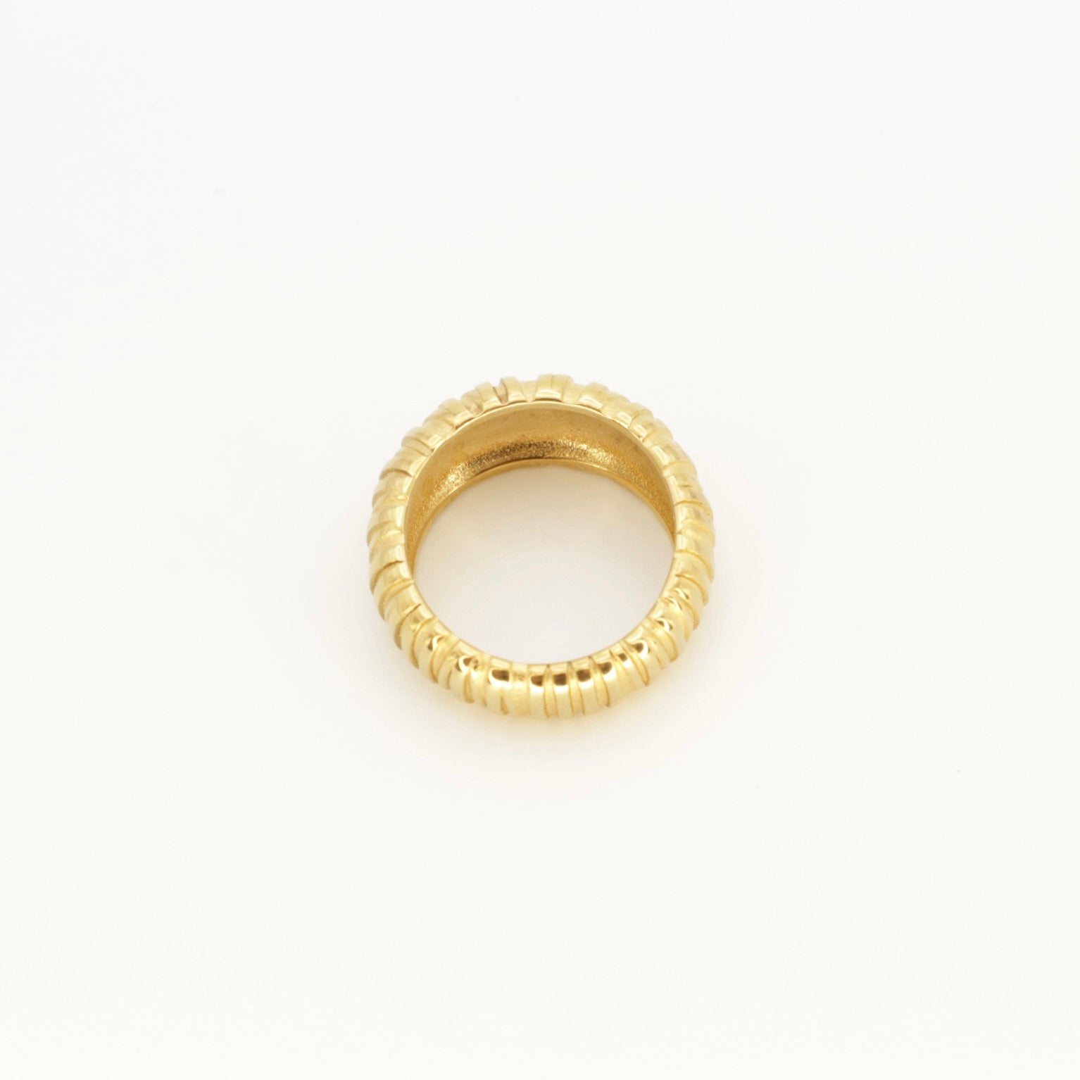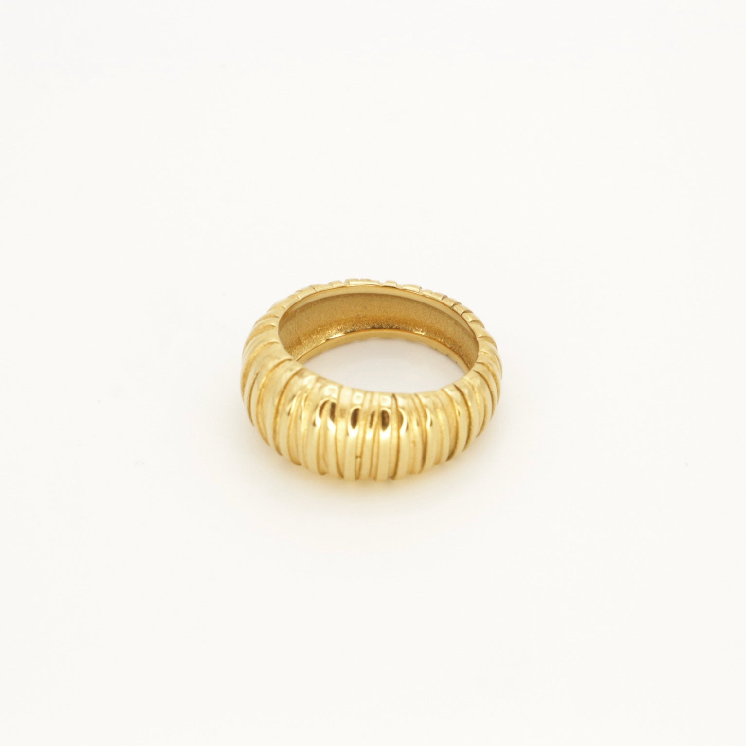 Description: This textured dome shaped croissant ring is made from Stainless Steel with 18k gold PVD coating. This intricate and striking piece is the ideal complement to your stackable ring collection. From the school run to lunch dates and girls' night, it's your stylish, everyday choice!
