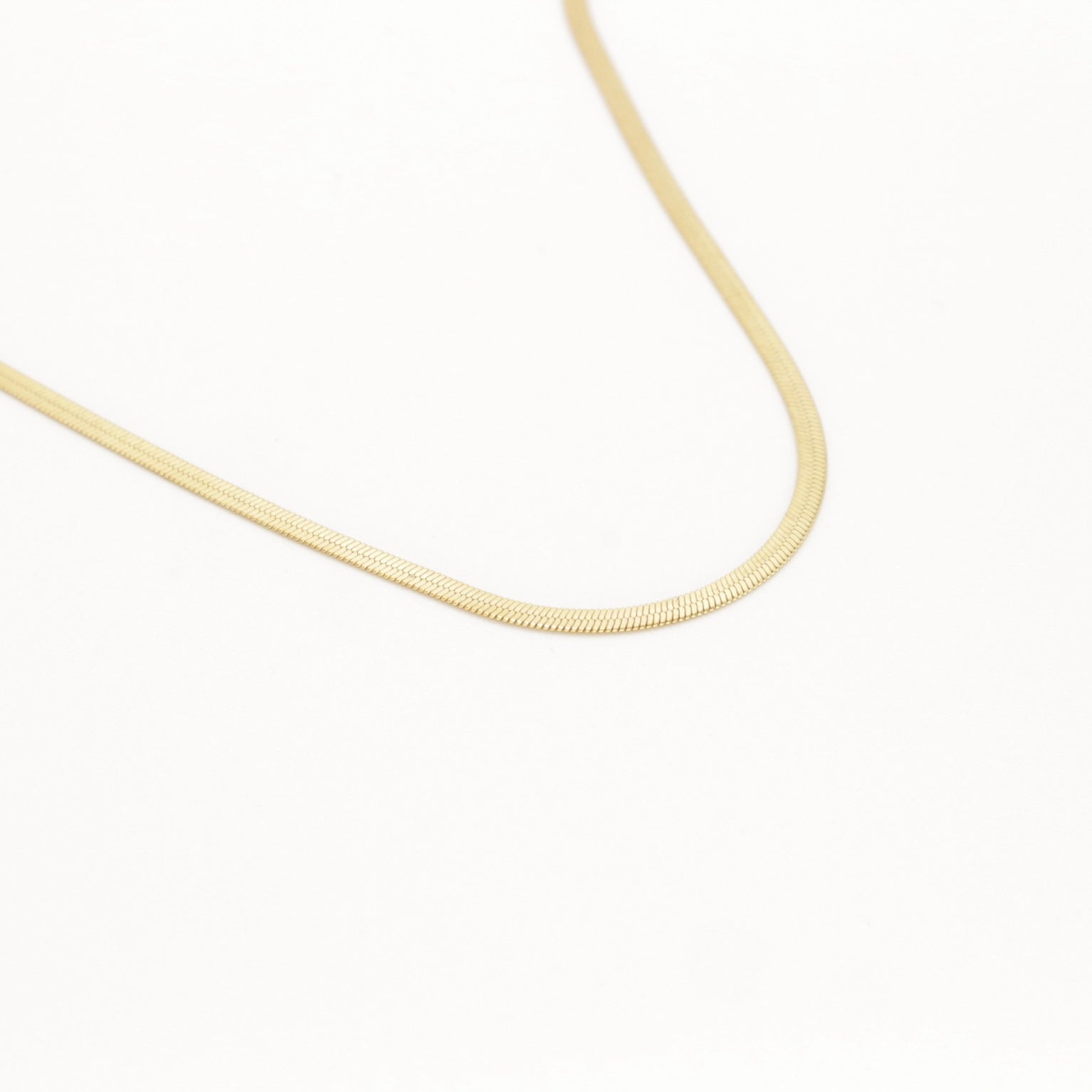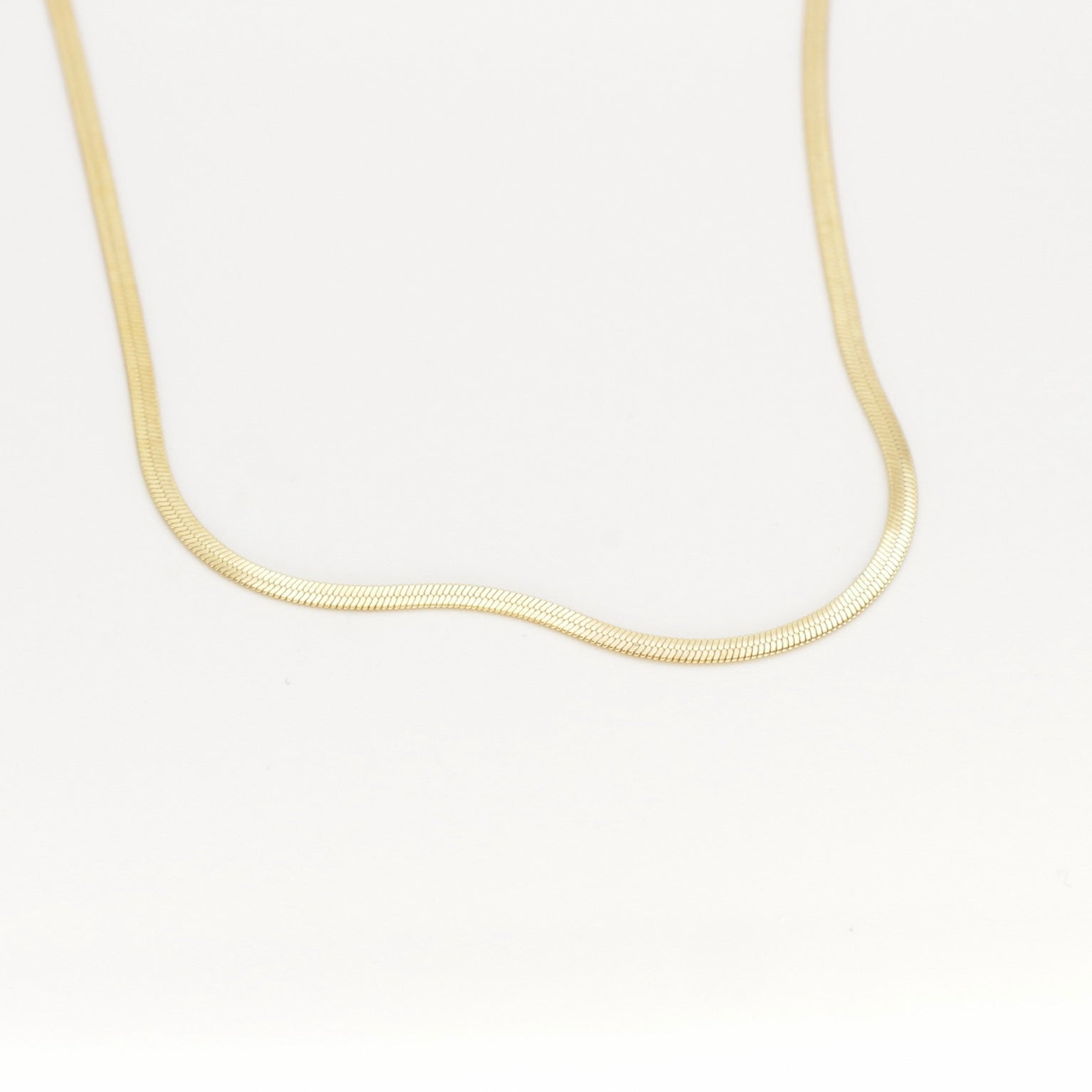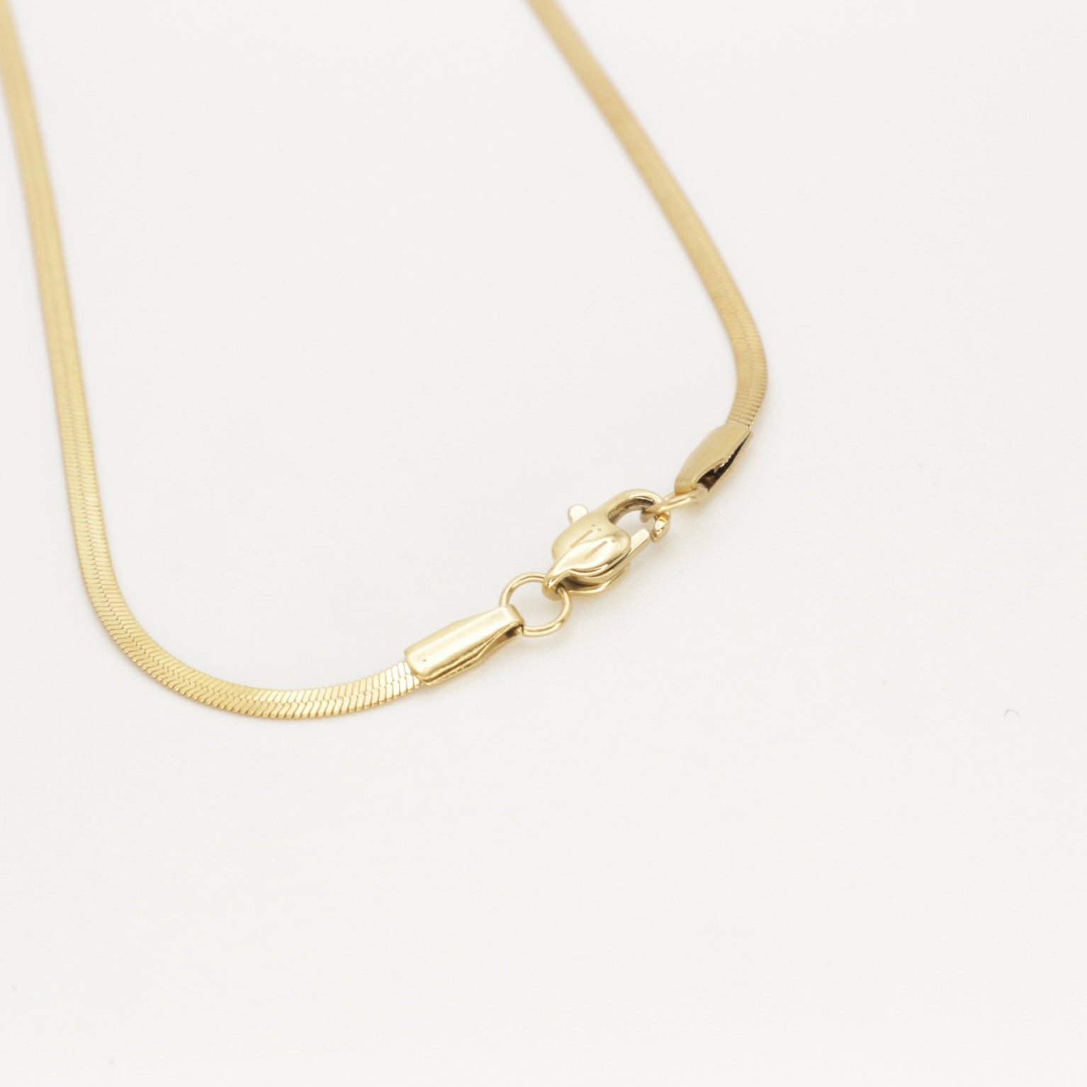 Description: This beautifully delicate herringbone flat snake necklace is made from Stainless Steel with 18k gold PVD coating. This will soon become your go-to and will accompany you during everyday moments. To be work alone or stacked with thicker NALIA and KIRA chains.