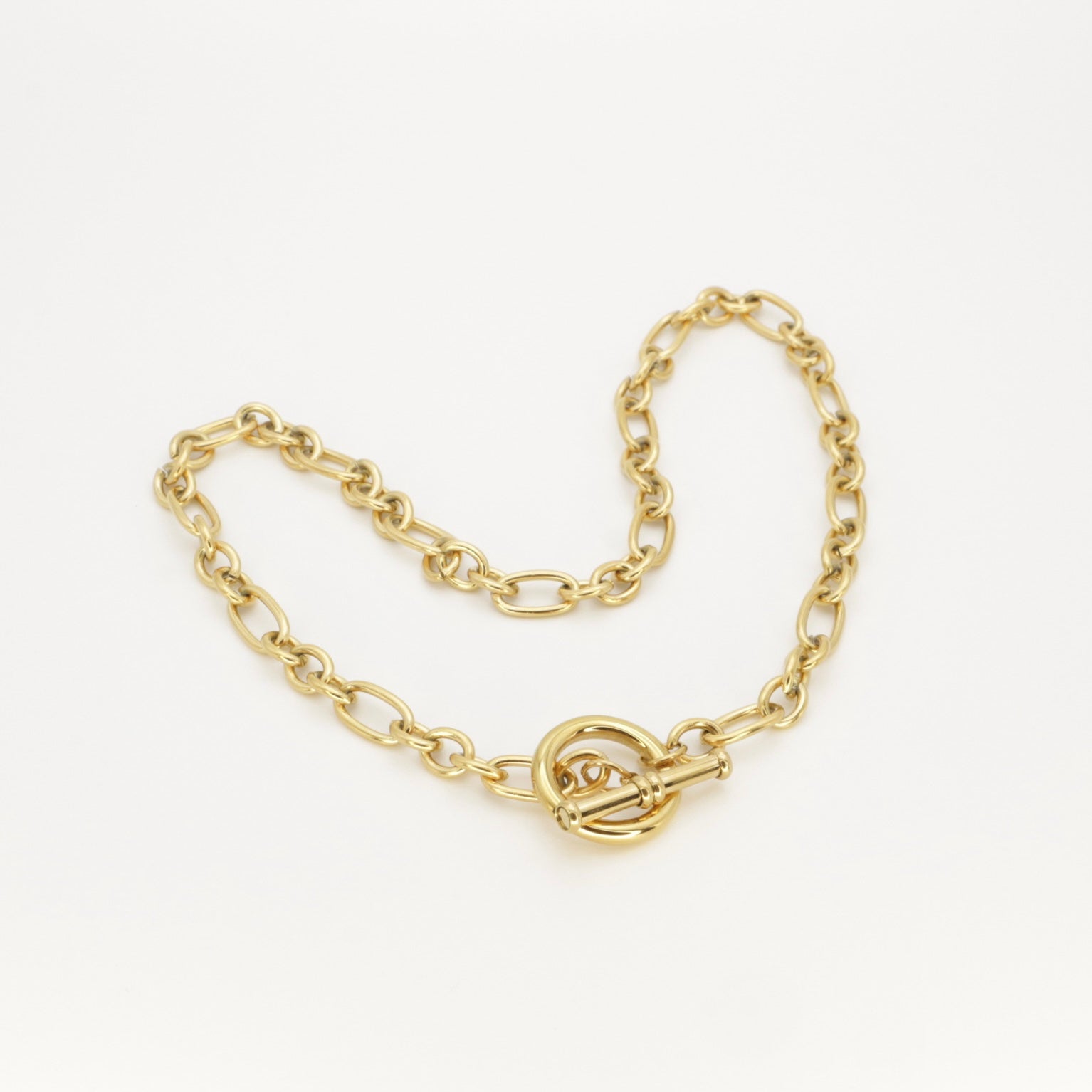 Description:This twisted link T-Bar chain is made with 18k gold PVD plating. This chain is versatile and can be worn on its own as a statement piece, or layered with one dainty stacking chains. The perfect addition to your wardrobe and stacking collection.